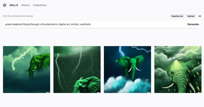 Moodboards can be one of the hardest parts of creating a large creative in PR. We want to make sure that we have a consistent and strong style for the video or advert we’re creating, but it can be hard to manually search Google for the perfect images. Now with DALL-E, we can generate almost any image that we need to. Need a green elephant flying through a thunderstorm (don’t know why you would)? BAM! It’s there.