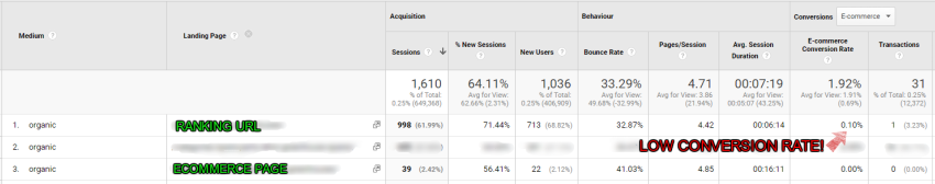 Why would you ever want to add a canonical to a page ranking so well? It’s a legitimate question and one that comes down to perceived searcher intent. We noticed that despite this page getting a lot of traffic from high rankings; the page, which contains vast amounts of information about the brand, does not convert well. Of nearly 1000 sessions over the course of 9 months, the page resulted in only one conversion. We wanted to use the canonical to test whether ranking the e-commerce page would result in a higher conversion rate and better experience for the users, who we logically thought would have their intent answered more successfully when directed to the e-commerce landing page for the greenhouse brand.