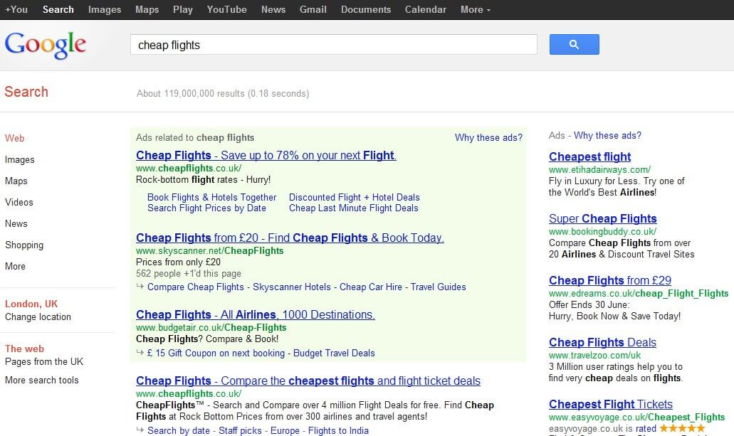 Over the years Google have loved to play around with the way the adWords ads are displayed in the SERPs. One of their favourite ways ways is to change the background colour of the ads.