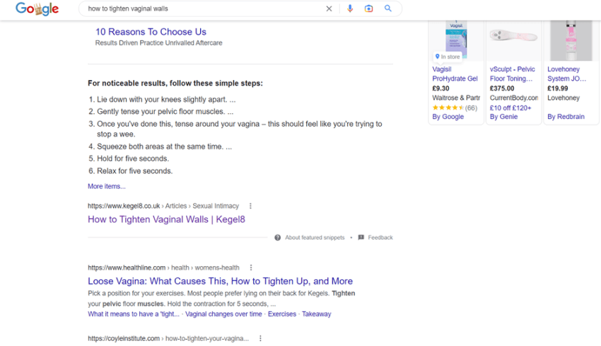 By analysing a key search term – like “how to tighten vaginal walls”– and creating digestible content that directly answers questions, you can rank above extremely reputable health sites like Healthline and WebMD, provided your content is accurate.