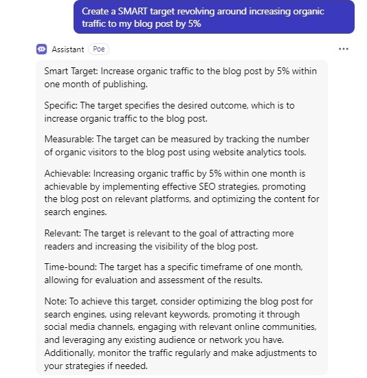 - Creating SMART Targets & Deadlines: Specifying the project and deadline specifications, and then asking AI to turn them into SMART targets are a quick and effective way to create manageable targets. Be sure to specify the exact timeframe these projects need to be completed in, however.