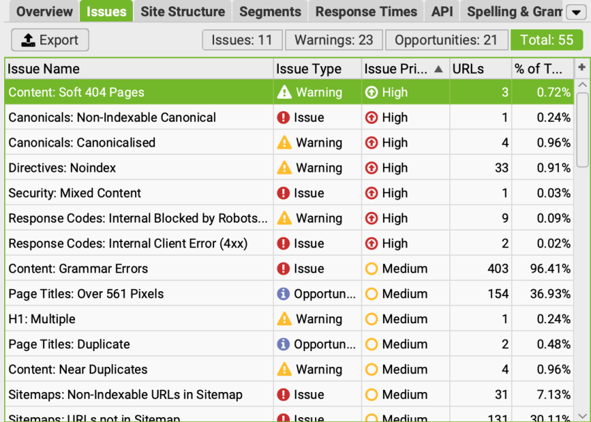 The data included here has the issue type describing whether it’s likely an ‘Issue’, an ‘Opportunity’ or a ‘Warning’. We also get an Issue Priority showing a ‘High’, ‘Medium’ or ‘Low’ priority based upon potential impact and those that may require more attention. It is also useful to see the number of URLs affected by the issue.