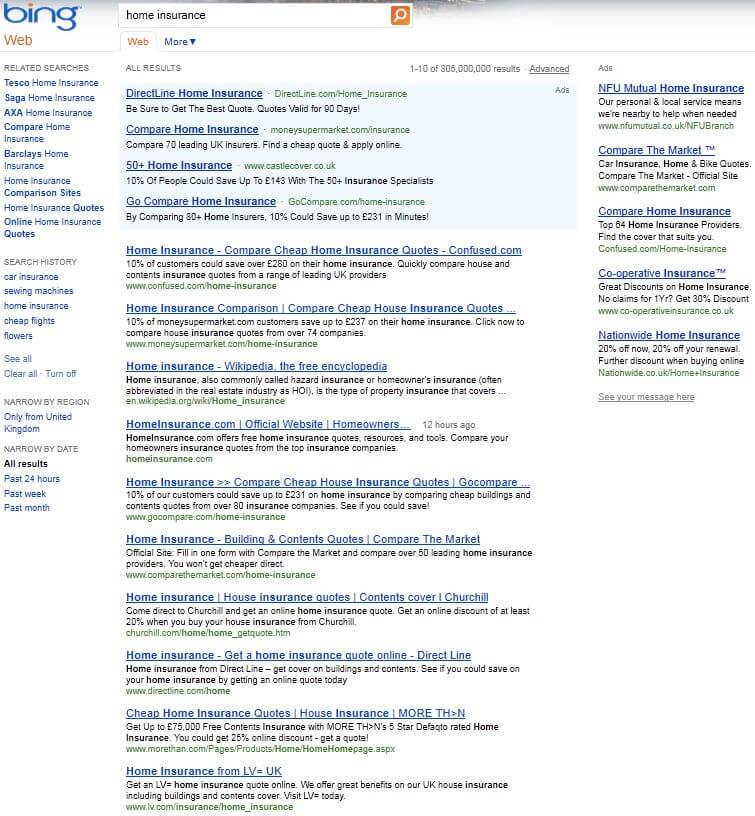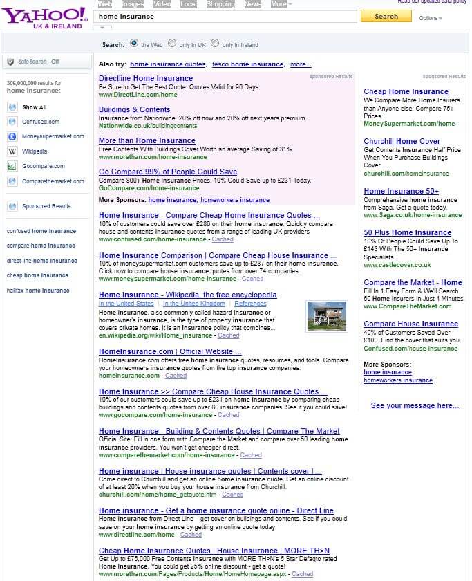 Just a quick post, we have just spotted that Yahoo organic results (in the UK) are now being powered by Bing. This happened sometime ago over in the US & Canada. Check the results below for a search for ‘home insurance’ for example.