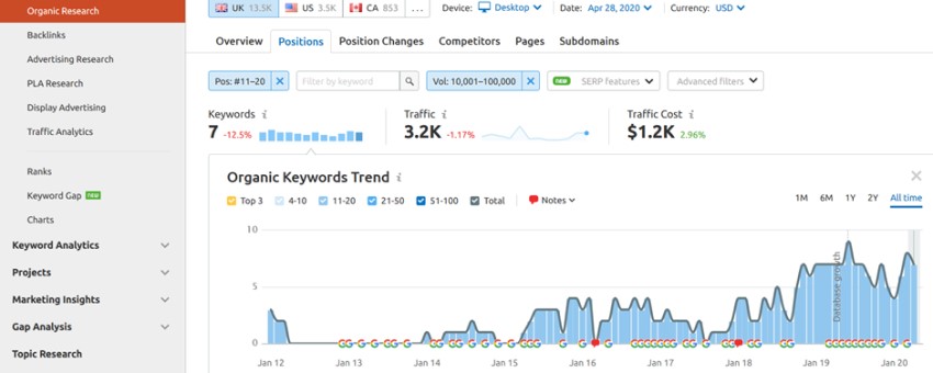 Domain Analytics > Organic Research > Positions: 11-20 > Volume: 10,001 – 100,000
