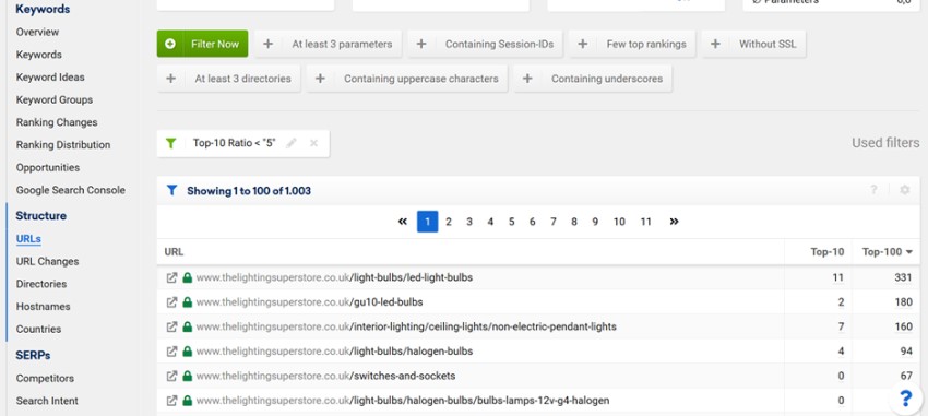Structure > URLs > Filters: Few top rankings > Top-10 Ratio: less than 5