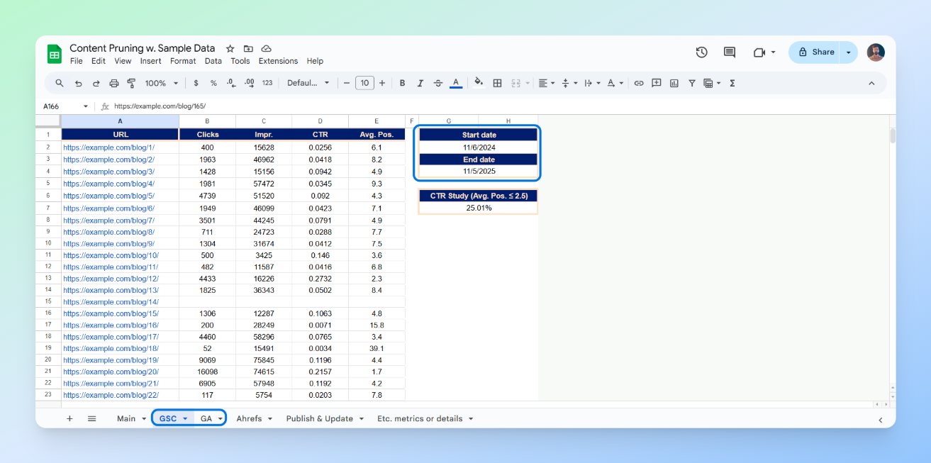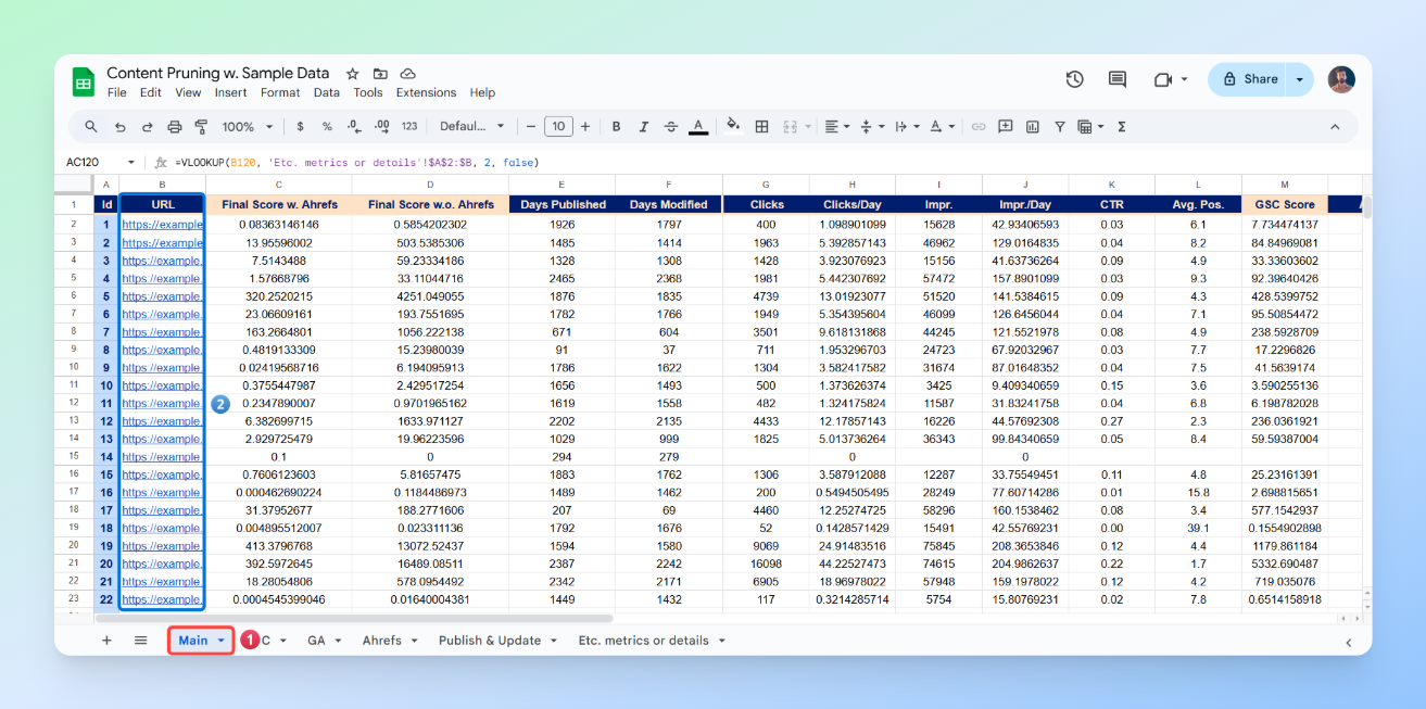 Our workflow is very simple. Just add data into the GSC, GA, Ahrefs, and Publish & Update Sheets, and enter the URLs in the Main Sheet. All other metrics will automatically populate using formulas.