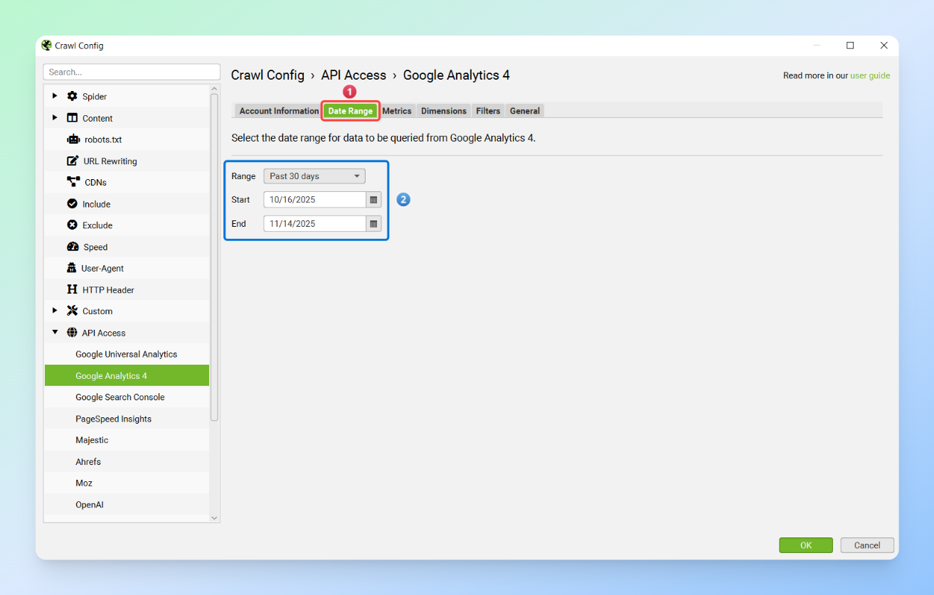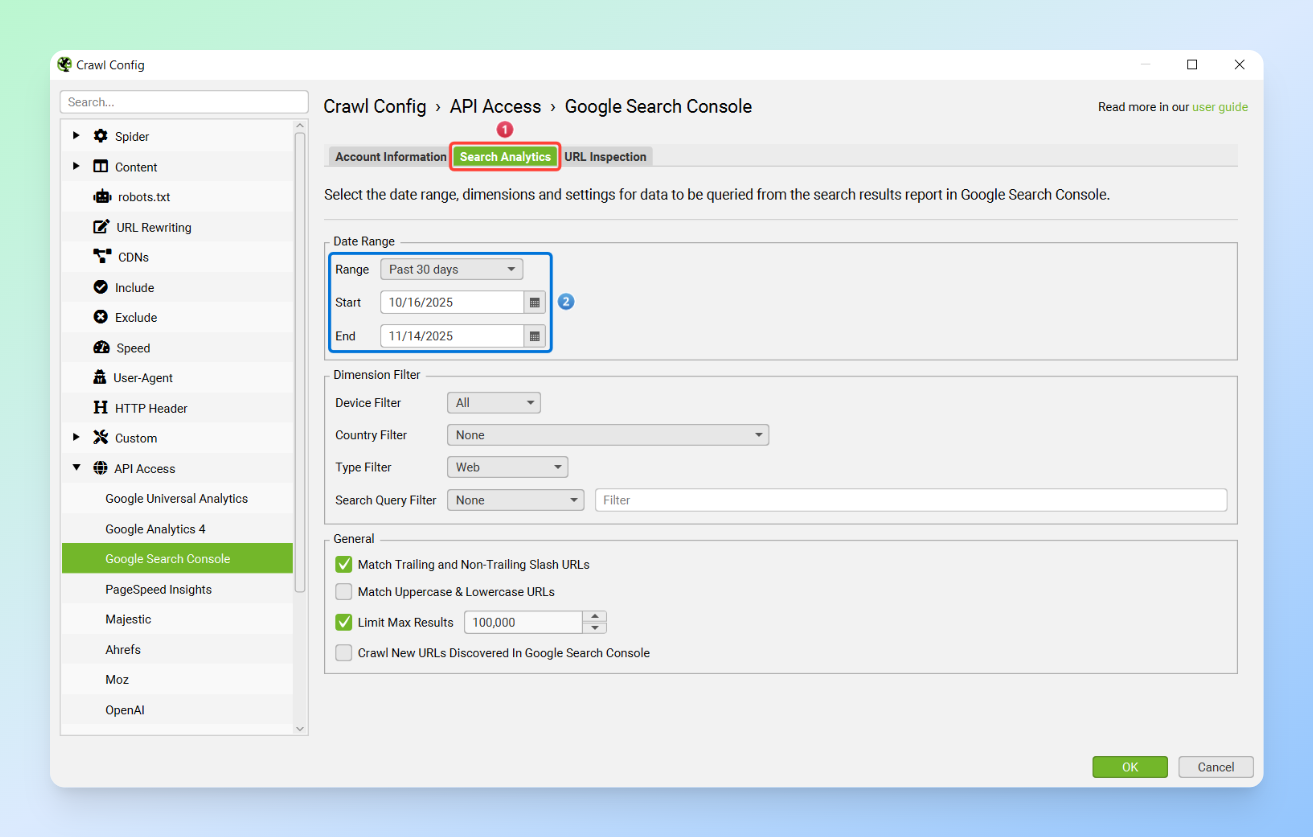 Note: Make sure that the start and end dates you use in the GSC and GA Sheets match the dates you entered in the API Access settings in the SEO Spider.