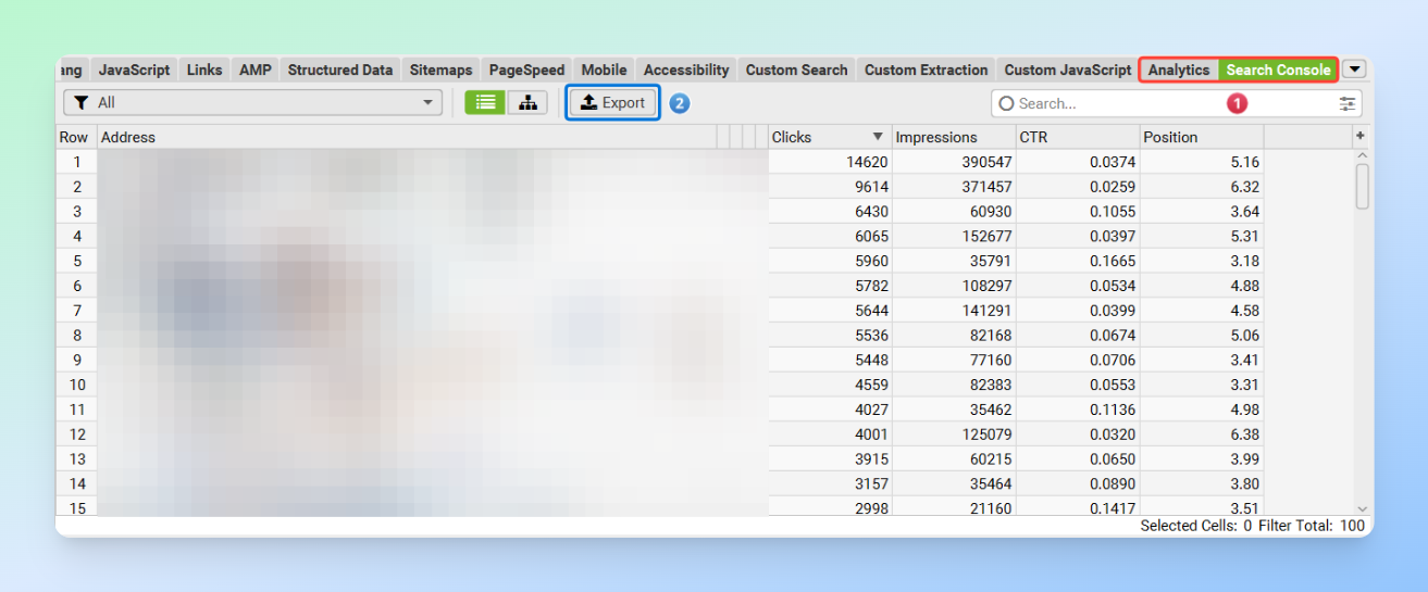 Next, set the SEO Spider’s Mode to List and enter your list of URLs. Then, export the data from the Search Console and Analytics sections and transfer it to your content pruning sheet.