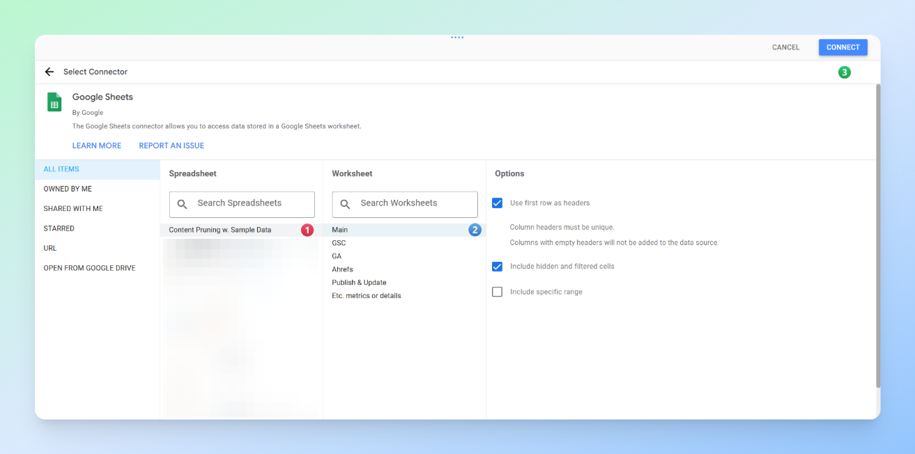 After that, locate the sheet you want, then in the top right corner click Connect, followed by Add to Report so your data source is added.
