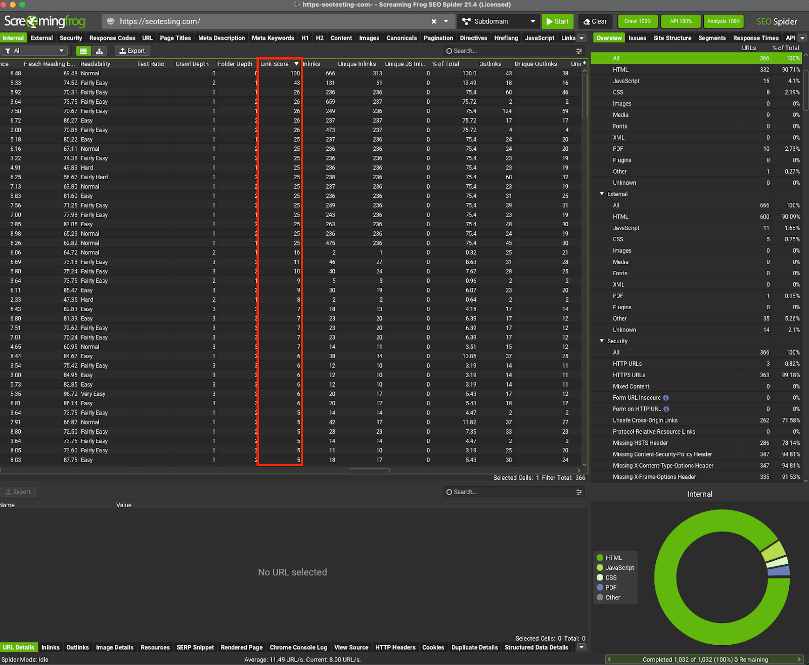 Note: Remember that scores vary by site, so compare similar page types against each other rather than using absolute values. Also remember that a good link score for one site might be different for another site, depending on what internal links are used, so use the above table as a guide.