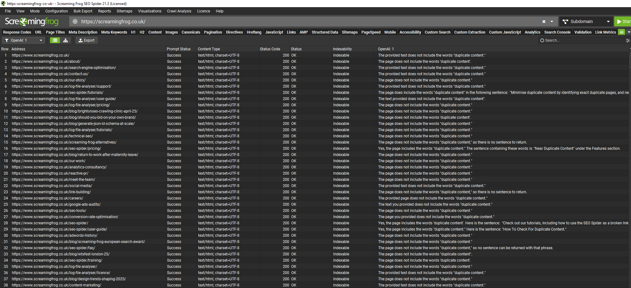 The integration works on a URL-by-URL basis. OpenAI does not see the full crawl or wider site context. It generates responses based only on the content of each individual page. This means internal link suggestions may rely on what is present within that page, rather than the full site structure.