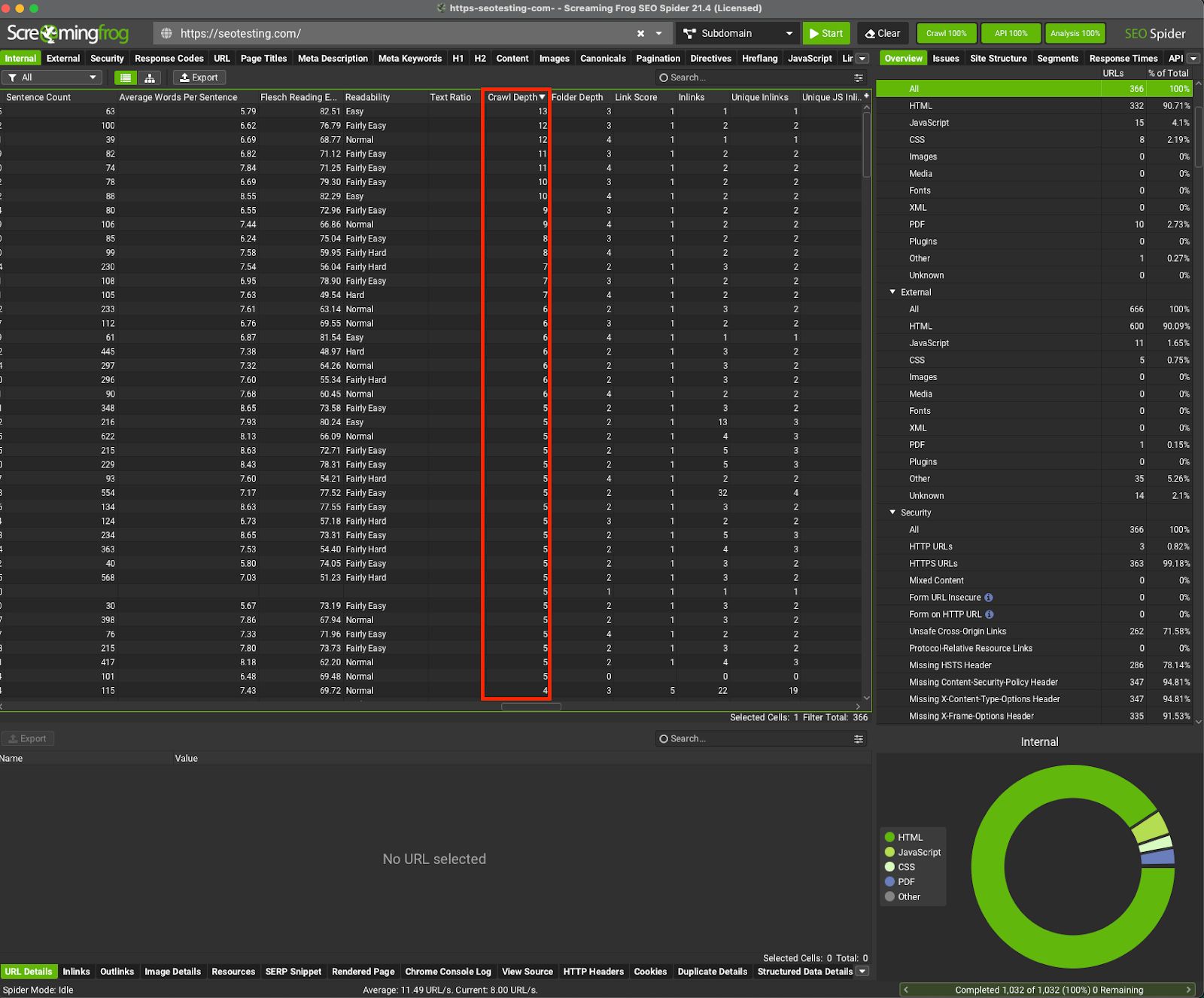 The first way is to complete a crawl of your site, select the ‘Internal’ tab, and then scroll across to the ‘Crawl Depth’ tab. Here you’ll see a list of your pages and the crawl depth they have.