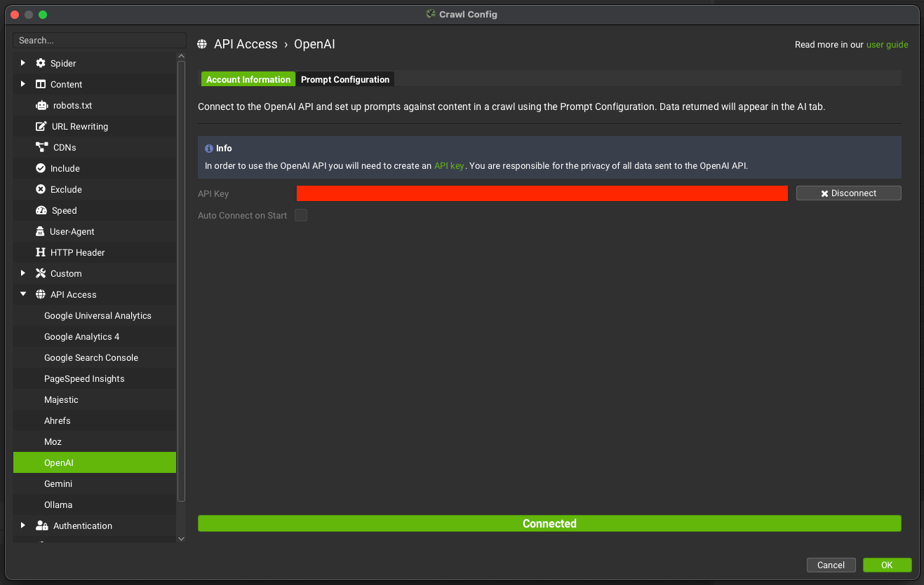 1. Head to “Configuration” > “API Access” > “OpenAI”