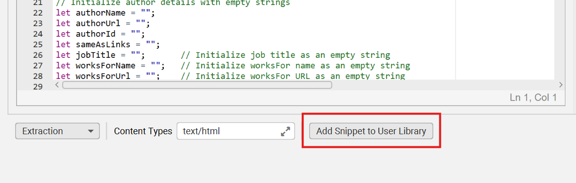 Once you’ve wrapped up your script and are satisfied with the final output, you can take an optional step and save the script into your custom JavaScript snippet library. Click on the ‘Add Snippet to User Library’ button to do so: