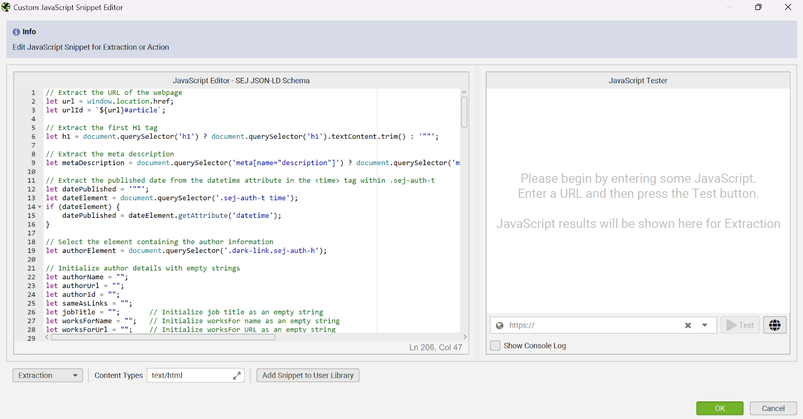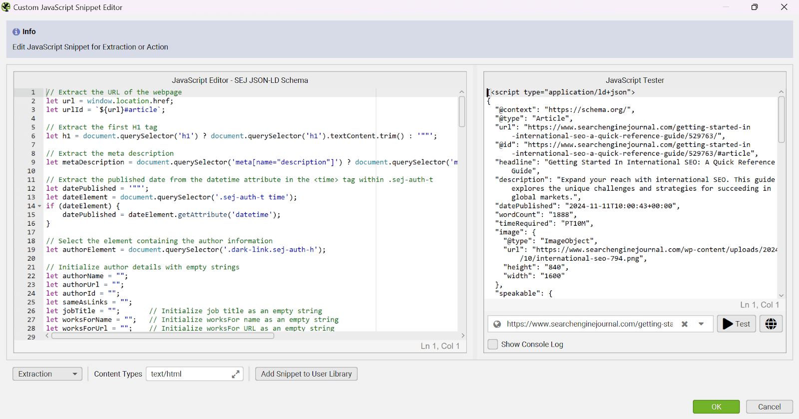 Copy-paste a test URL into the URL input field and click the ‘Test’ button. Once the test crawl is complete, you should see your JavaScript snippet output in the tester box: