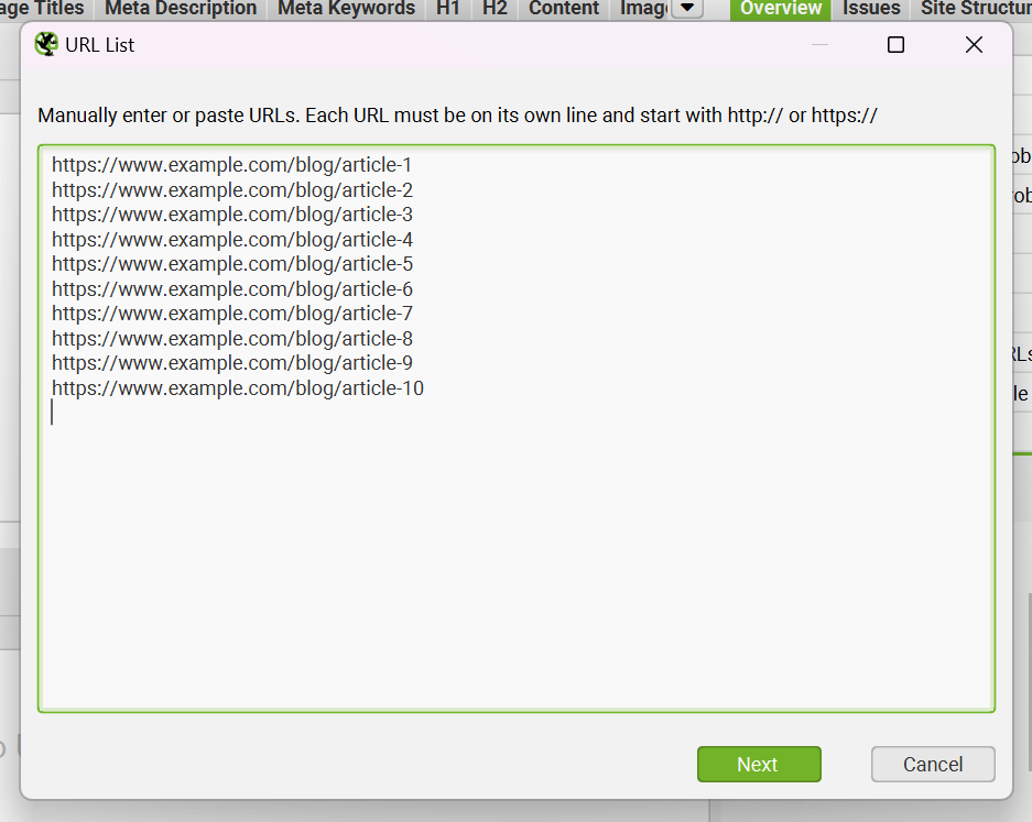 Add a sample of 10 URLs as a test in the popup input box to ensure that the JSON-LD output is correct across all pages.