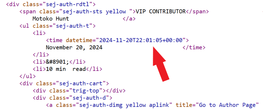 If authorElement is found, the text content of the authorName is extracted and trimmed of whitespace. The authorUrl extracts the href attribute of this element, which is the link to the author’s profile page. The authorId is a constructed identifier that appends /#person to the authorUrl, which creates a unique ID for structured data.