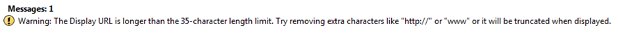 Usually when you upload an ad with a display URL of over 35 characters (in Editor) you are shown a warning letting you know that you have entered a URL that is too long to be displayed and that to ensure that it meets the 35 character limit it will be truncated when shown. This is something I have been playing around with for a while and up until this week my URLs have usually been truncated (by dropping the www or the directory) to make sure they meet the 35 character limit.