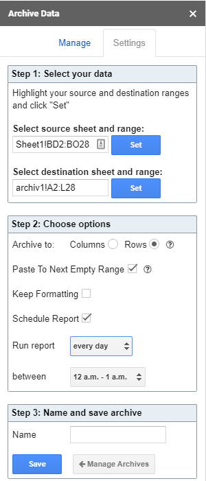 • As a destination, we select the tab “Archive”, with a range of archive1!A2:L28