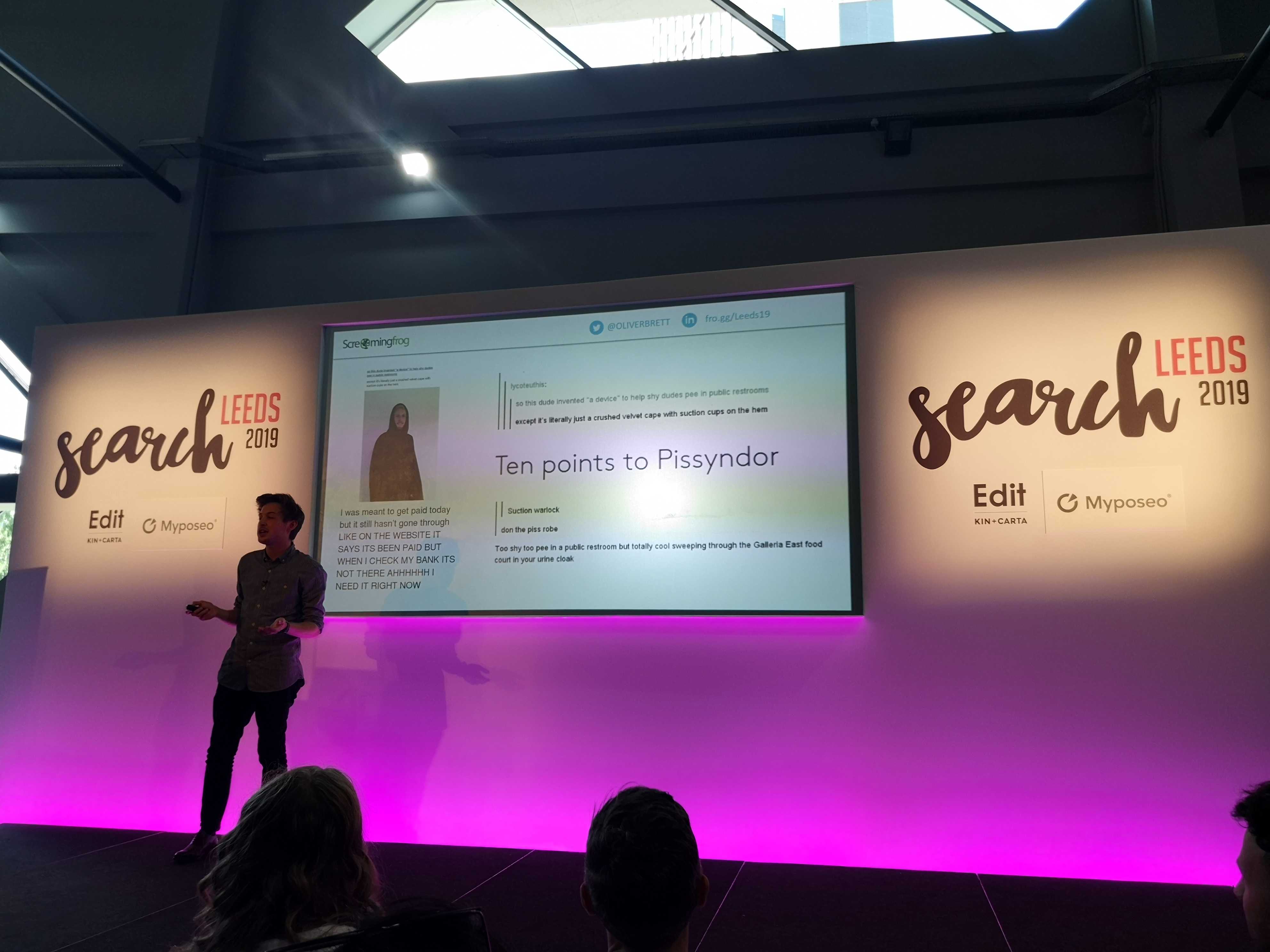 Stop number two on @OliverBrett’s talking tour landed him at SearchLeeds. Returning after popular demand, Oliver graced the stage discussing how a ‘pee cape’ and ‘Solar Led T-Shirt’ can land you some pretty impressive national coverage.