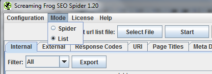 To upload your own list you simply need to look under ‘Mode’ and change the setting to ‘List’ instead of ‘Spider’. Once this has been done you can select the file you want and upload it to the tool. Once you’ve uploaded the file the spider will then tell you how many unique URLs it has found.