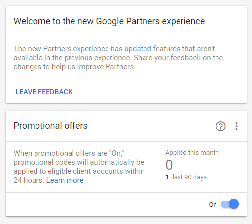 I’m not however, too sure about the moving of Partners to the MCC level. Moving Google Partners and Insights has seemed to have reduced what information is available heavily, with only one box to leave to feedback and another showing promotional offers. It is also not entirely clear where these promotions are being attributed to, with no campaign ID being mentioned anywhere on screen.