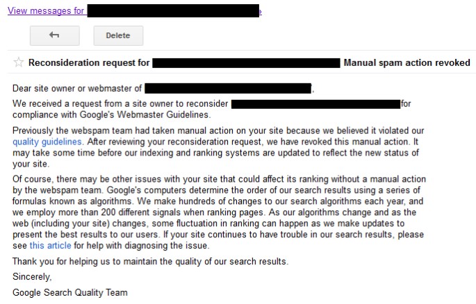 Our old client removed the hyperlinks and submitted a reinclusion reconsideration request to Google. Exactly 18 days later, they received a message saying the manual action had been revoked –