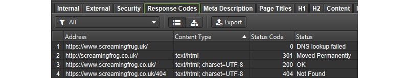 A full list of the statuses the Spider encountered while crawling can be found in the Response Codes tab, as well as reporting on any URLs where it was unable to get a response from the server (DNS lookup failed, robots.txt blocked, connection timeout, etc.)